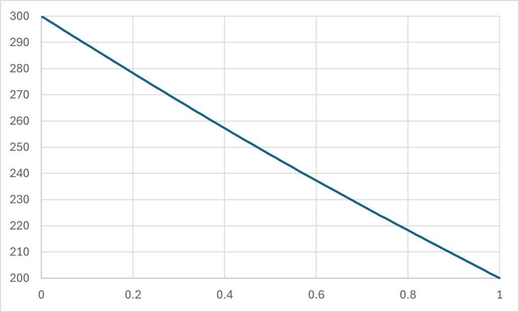 T_{L}=300\\T_R=200Once we have reached a steady state (i.e. no more change in time, [katex]\partial T/\partial t \rightarrow 0[/katex]), we would expect a linear temperature profile between the left and right boundary.