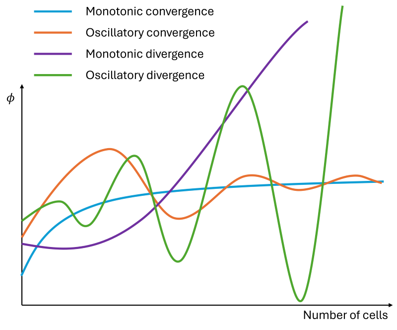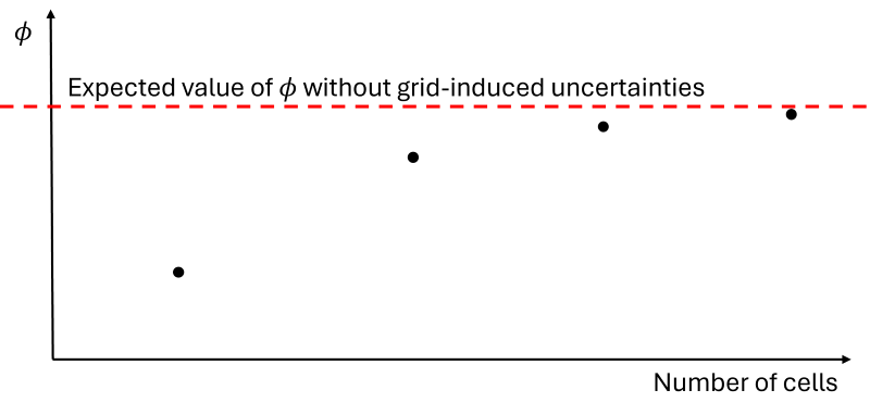 This is shown in the following figure, where the quantity of interest is shown here as [katex]\phi[/katex] and how it changes with an increase in the number of cells in the mesh. At some point, we only get small changes, and as we increase the mesh size, we will asymptotically approach the red line, which represents a precise measurement of our quantity of interest.