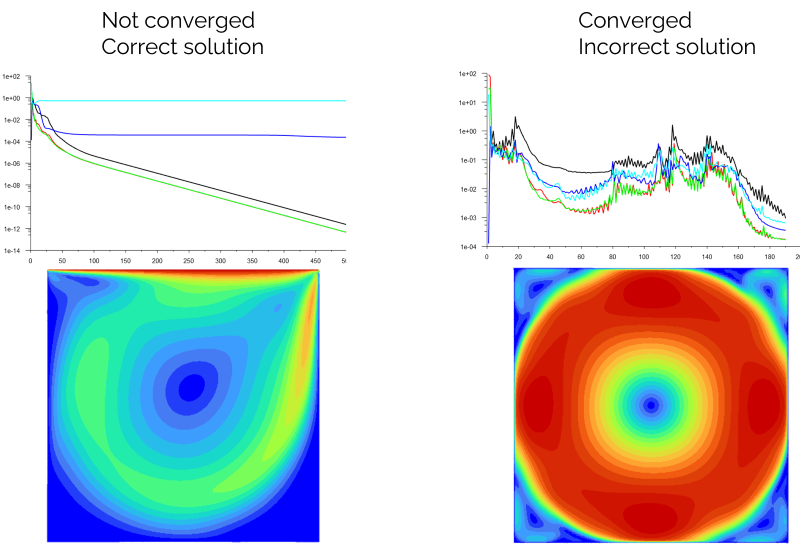 On the left, we see the correct behaviour, where the main vortex forms. The residuals, however, plateau and do not get below a convergence threshold. On the right, we see an incorrect behaviour, but the residuals have converged to the relatively modest convergence threshold of 1e-3.