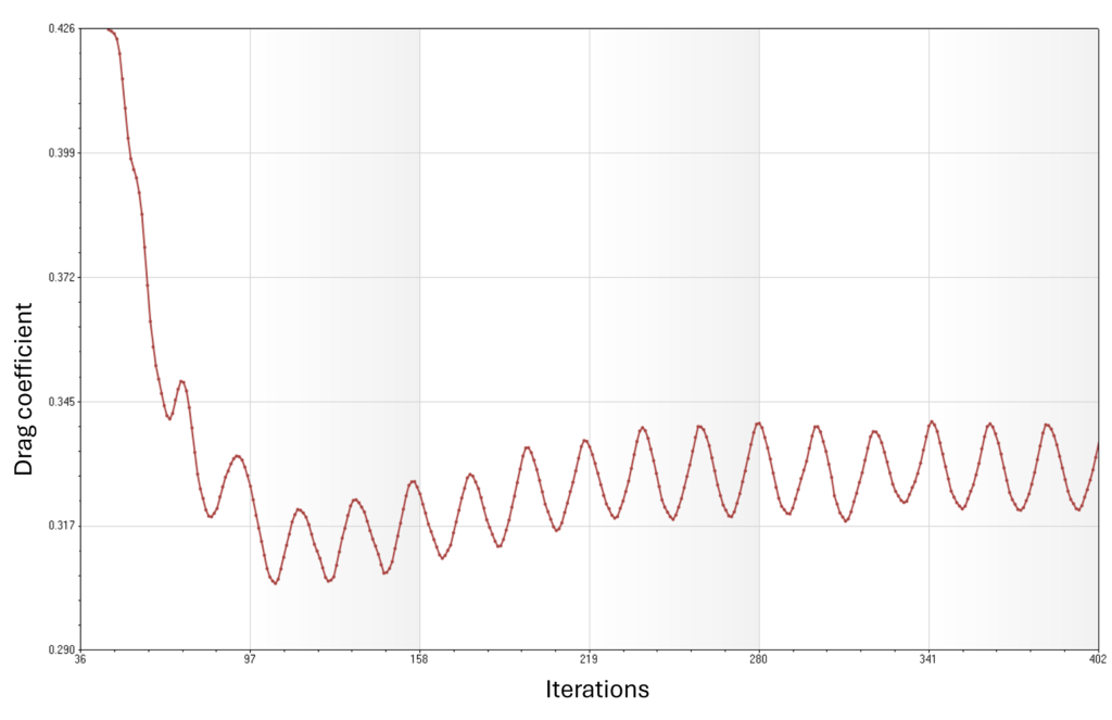 Let's say the solution has converged at around 280 iterations. What is the corresponding drag value at the end of the simulation (at 402 iterations)? The drag value oscillates between 0.32 and 0.34, and if we were just to take the value at the last iteration, we would get some value in this interval, but is it an accurate value? We can probably all agree that taking an average drag coefficient over a number of iterations, say, 150 or so, would probably give us a more accurate reading of the true drag coefficient.