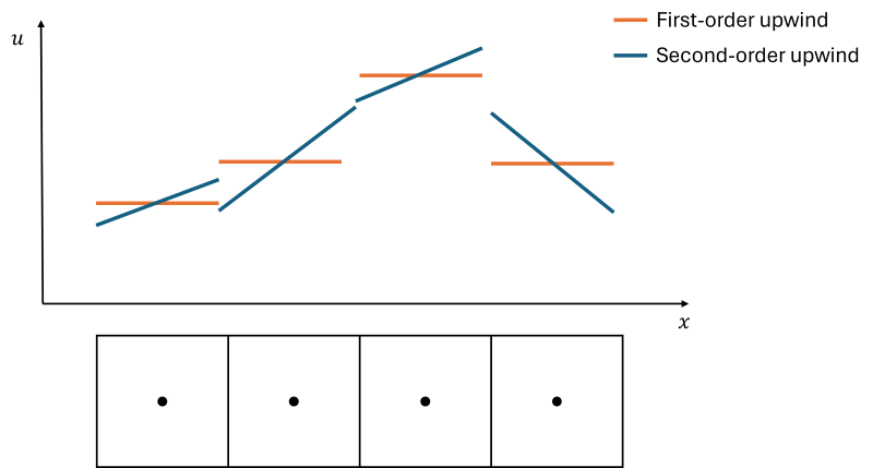 Here, an arrangement of cells is shown at the bottom, and we can see how the solution is assumed constant across cells in the first-order scheme while variation is allowed in the second-order scheme. If the signal (in this case, [katex]u[/katex]) is smooth, then we get small discontinuous changes going from cell to cell, but in the case of compressible flows, we may get shock waves, where these changes get larger.