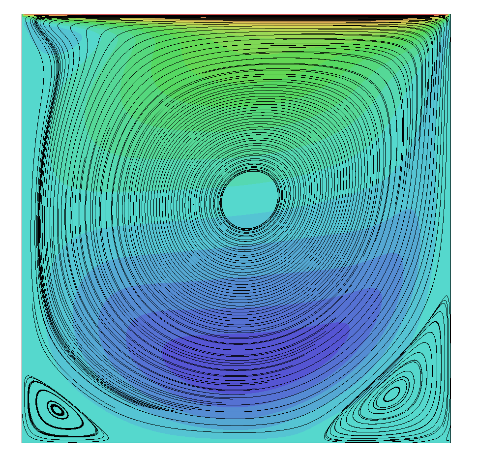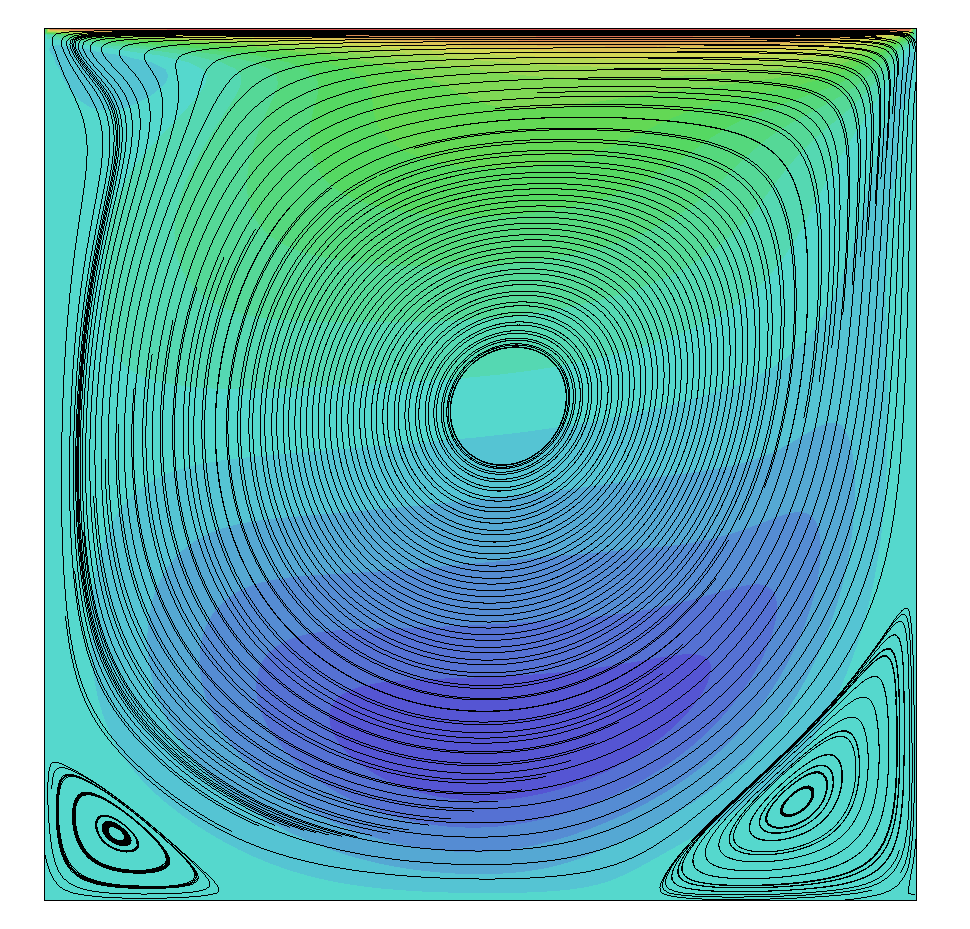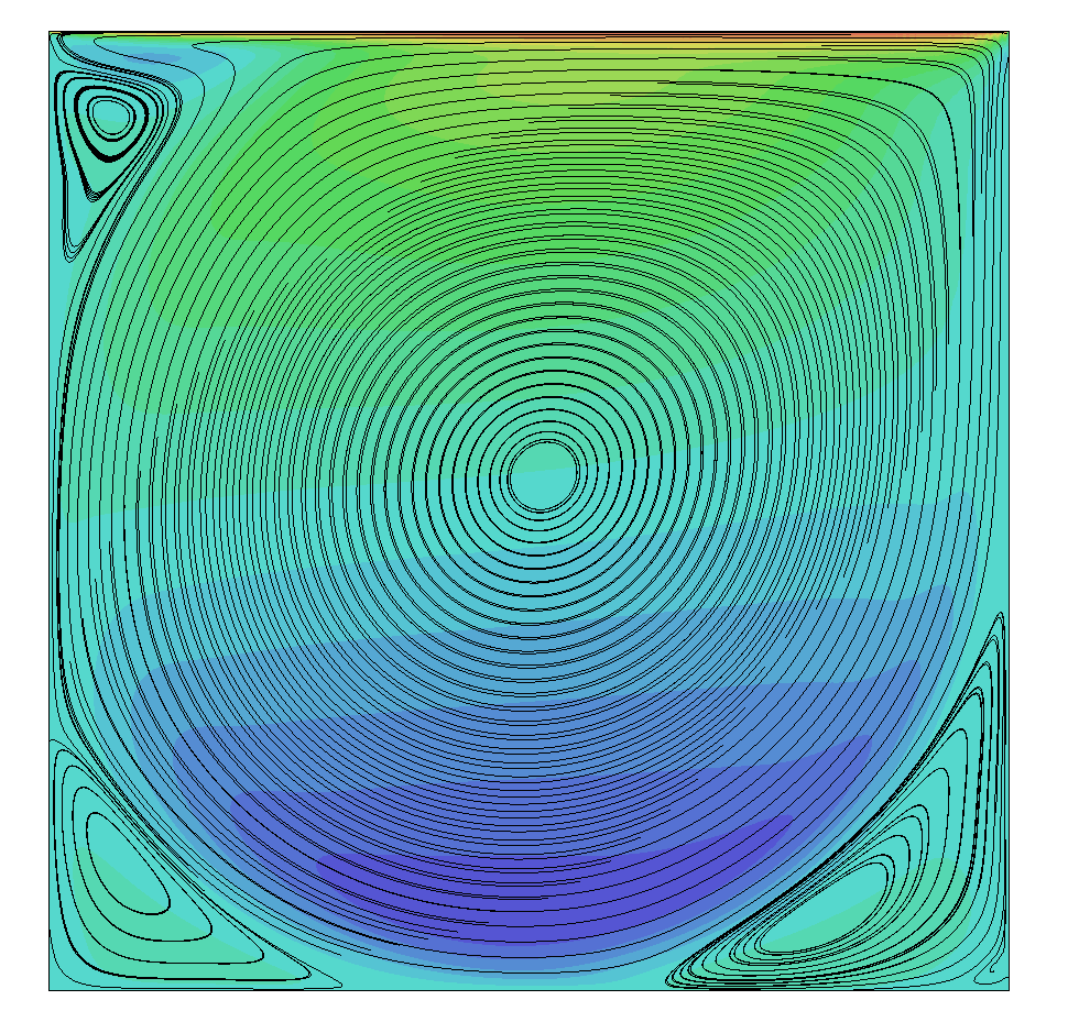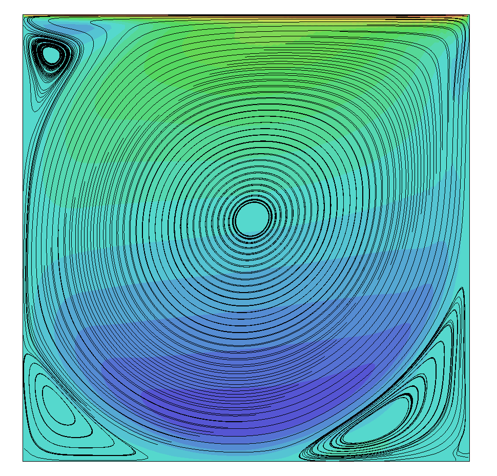As the Reynolds number increases, smaller secondary, and even tertiary vortices will form in the corners of the domain. Turbulence starts to kick in and all of a sudden we have a complex flow to handle, even with this relatively simple set up.