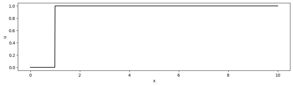 Below is a simple step function that we wish to transport with our advection equation. We are using the same discretisation that was used for the modified equation analysis (i.e. first-order upwind in space and first-order Euler in time).