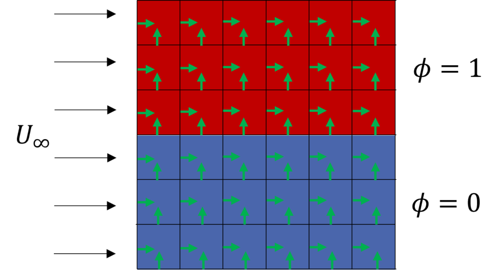 In both cases, we have added a passive scalar [katex]\phi[/katex]. If this is the first time you are hearing about a passive scalar, think of it as a quantity that is released into the flow to visualise its movement. The passive scalar is simply advected and diffused with the flow to visualise it.