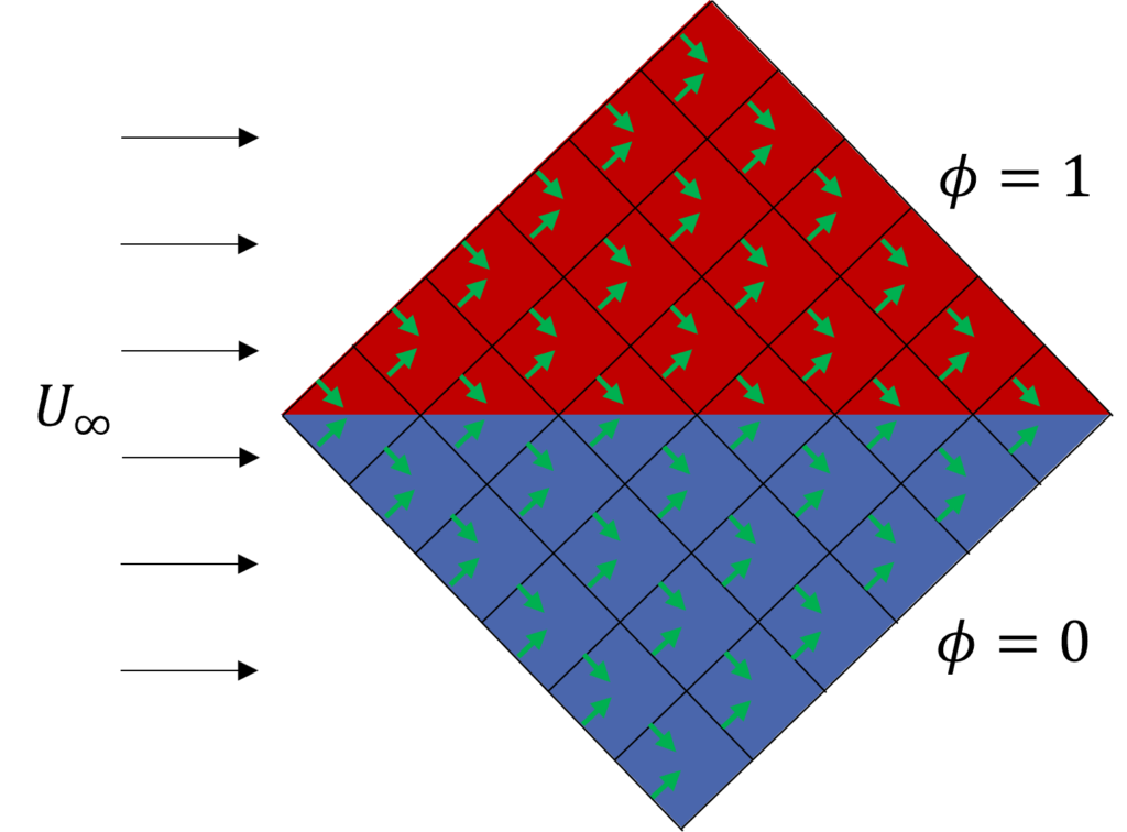 The second case on the right solves the exact same case and setup, with the only change being that the domain is turned by 45 degrees. This changes the orientation of the cells, where the normal vectors of each face, shown in green, are now at a 45-degree angle with the incoming flow. The first case has either a parallel or perpendicular alignment between its normal vectors and the incoming flow.