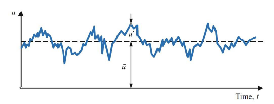 \underbrace{u}_{\mathrm{instantaneous}}=\underbrace{\overline{u}}_{\mathrm{average}} + \underbrace{u'}_{\mathrm{fluctuations}}\tag{45}This is also schematically shown in the following figure: