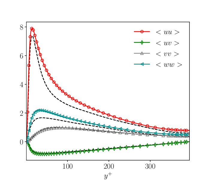 We can see that the Reynolds stresses are not equal to zero even far away from the wall (large [katex]y^+[/katex] values). It is precisely these additional terms in the Navier-Stokes equations which generate turbulence by converting (laminar) kinetic energy into turbulence kinetic energy.