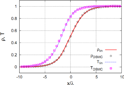 So, if we were to refine our mesh to have a mesh resolution of the order of [katex]\lambda[/katex], does it mean that we get the same smooth shock wave structure? Not quite. The Navier-Stokes equation is based on the continuum assumption; that is, we assume that we can describe the flow as a collective behaviour of the underlying particles. The figure above used the Direct Simulation Monte Carlo method (DSMC), which is based on a particle description. Therefore, it is able to resolve the shock wave smoothly.