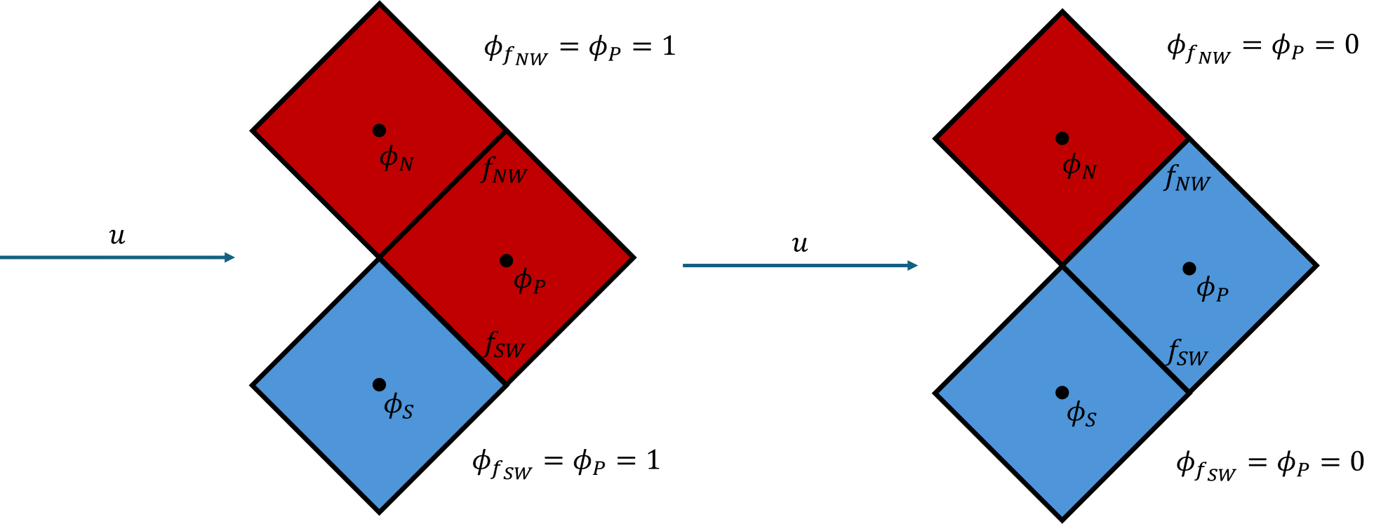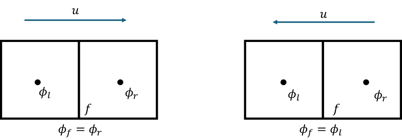 Here, we have two cells and want to obtain the value of [katex]\phi[/katex] at the face. For the case on the left, the velocity is going from the left to the right, and for the case on the right, it is going in the opposite direction, as indicated by the arrows above each case.