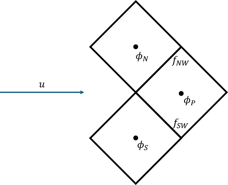 \sum_{f=0}^{nFaces} u_f \cdot n_f \phi_f A_f \tag{40}We see that [katex]\phi_f[/katex] is now evaluated at the cell's faces (as indicated by the subscript). So, we need to find its value on the face. For this, consider the following case: