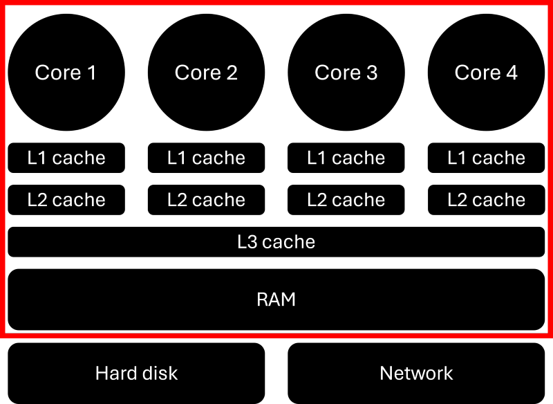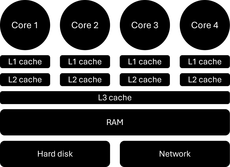 As we go from hard disk to RAM, from RAM to L1/L2/L3 caches, and finally from our caches to registers sitting within each core (not shown here, but each core has its own private memory called registers), we decrease the time it takes to read and write memory, which comes at the cost of decreasing the size of each memory unit. I have talked at length about caches in my article on memory management, which you may want to check out for additional insights. In there, you will find the following image: