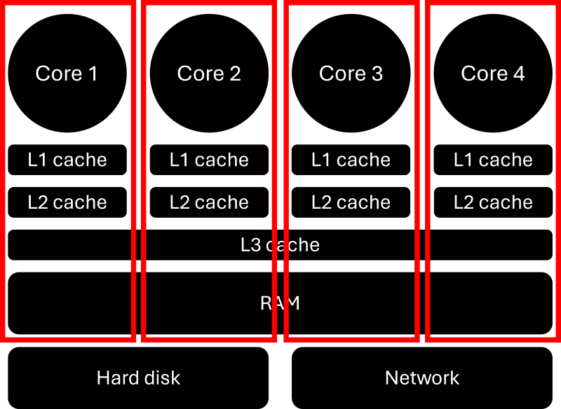We now say that each core has its own L1 and L2 cache, just as before, but we create barriers on the L3 cache and RAM, which means that each core will have its own private address space on the L3 cache and RAM, which none of the other processors can access. Why is this appealing? Well, if I know how to communicate memory with my neighbouring core and I need some data from it, then it doesn't matter if the core is sitting on the same CPU, the same (or a different) compute node in a cluster, or even somewhere in a geographically different location.