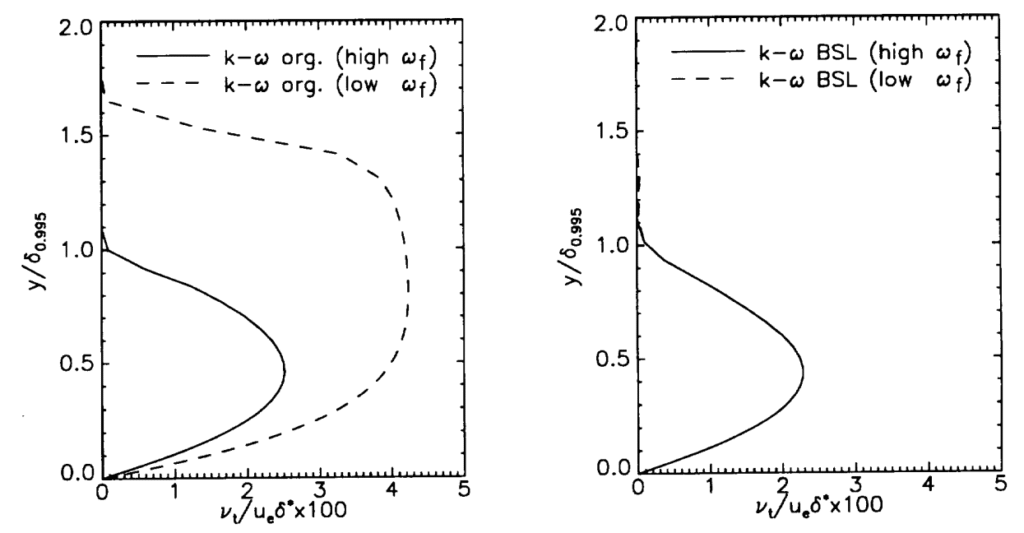\nu_t = \tilde{\nu}f_{\nu 1}\approx\tilde{\nu}\tag{189}There are additional damping functions and closure coefficients in this model, but all they do is to modify the production and destruction terms in Eq.(183). A list of these can be found at NASA's turbulence resource page.