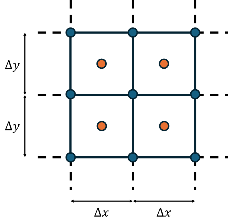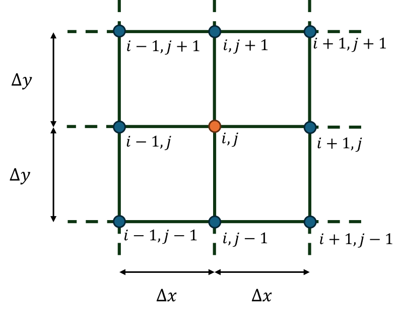 In this case, we have a regular Cartesian grid. We can see that each cell has the same width and height [katex]\Delta x[/katex] and [katex]\Delta y[/katex], respectively. If we want to obtain information from one of the surrounding grid points, we need to be able to index them.