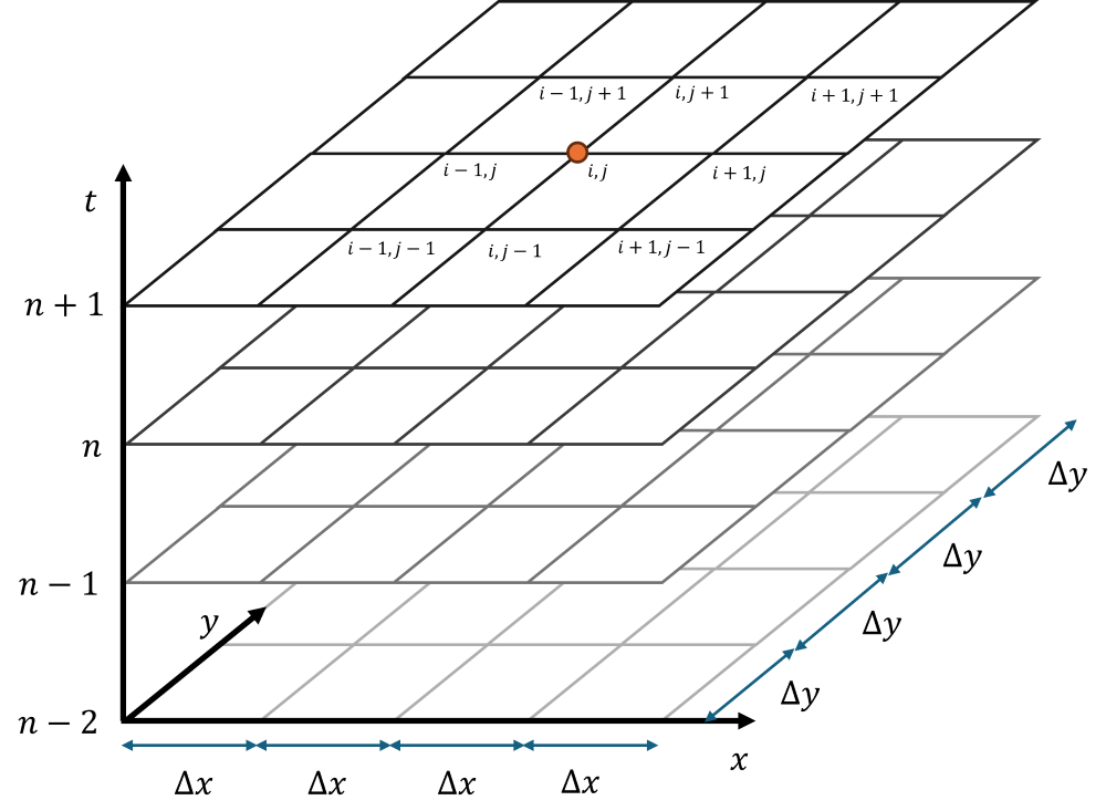 Here, we see that we have to introduce a third axis in time for our 2D Cartesian grid. We can now have solutions for each grid point at different time levels, which are usually labelled with the letter [katex]n[/katex]. The current time level [katex]t[/katex] is thus labelled as [katex]n[/katex], while a Taylor series expansion in time, i.e. [katex]t+\Delta t[/katex] is labelled as [katex]n+1[/katex].