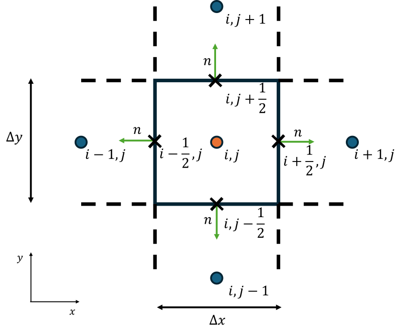 n_{i,j+\frac{1}{2}}\cdot\mathbf{u}_{i,j+\frac{1}{2}}A_{i,j+\frac{1}{2}}=\begin{bmatrix}0\\1\end{bmatrix}\cdot\begin{bmatrix}u_{i,j+\frac{1}{2}}\\v_{i,j+\frac{1}{2}}\end{bmatrix}\Delta x=v_{i,j+\frac{1}{2}}\Delta xn_{i,j-\frac{1}{2}}\cdot\mathbf{u}_{i,j-\frac{1}{2}}A_{i,j-\frac{1}{2}}=\begin{bmatrix}0\\-1\end{bmatrix}\cdot\begin{bmatrix}u_{i,j-\frac{1}{2}}\\v_{i,j-\frac{1}{2}}\end{bmatrix}\Delta x=-v_{i,j-\frac{1}{2}}\Delta xPutting this all together and assuming now an explicit time integration, we arrive at: