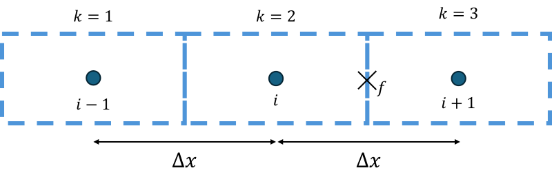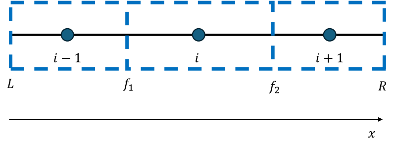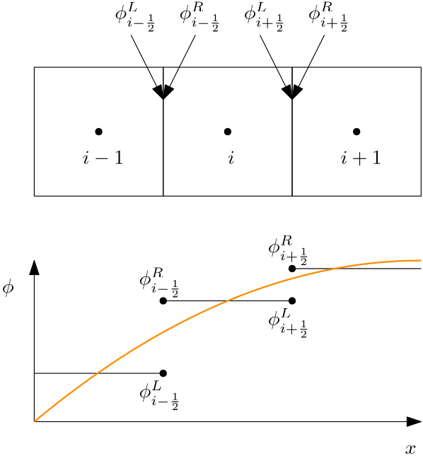 Here, we are approximating some quantity [katex]\phi[/katex] on a grid with three cells. Within the finite volume method, we calculate fluxes across the faces that are shared between cells, and that means that all numerical schemes for the finite volume method are concerned with interpolation.