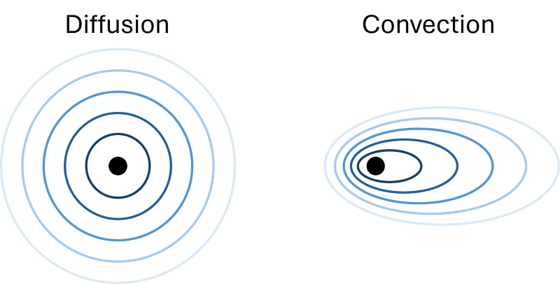 In this case, diffusion is still present, but the information propagation is skewed heavily towards the right, as we have to superimpose the speed of diffusion with the incoming velocity. We can quantify this behaviour using the Péclet number, which is given as: