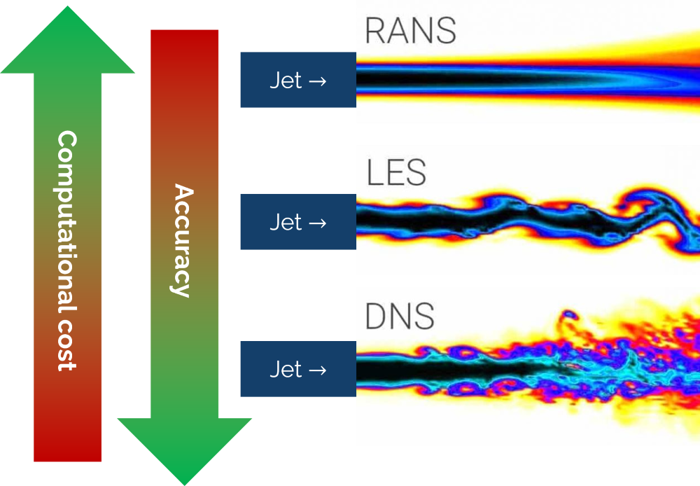 We can also see that as we move from RANS to LES, and from LES to DNS, the resolution (and thus accuracy) increases, but that comes at the cost of increased computational cost. Our job as CFD engineers is to select the best turbulence modelling approach that still captures the bulk flow, while not using more resources than absolutely required.