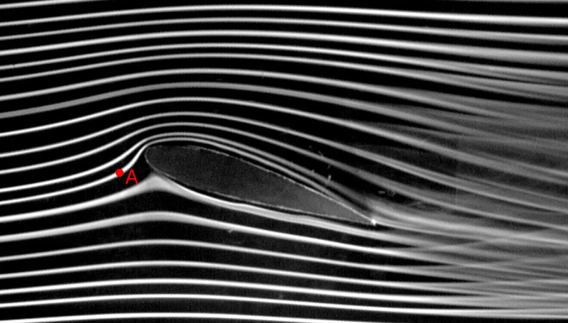 How does the flow at point A know that it has to curve upwards so to flow over the airfoil? At point A, the flow hasn't seen (or felt) the presence of the airfoil, yet it deflects upwards. The answer is that the flow is elliptic. Once the first particle hits the airfoil, it will propagate that information (through pressure waves) back upstream, so the flow at point A will be influenced by the disturbance created downstream of point A.