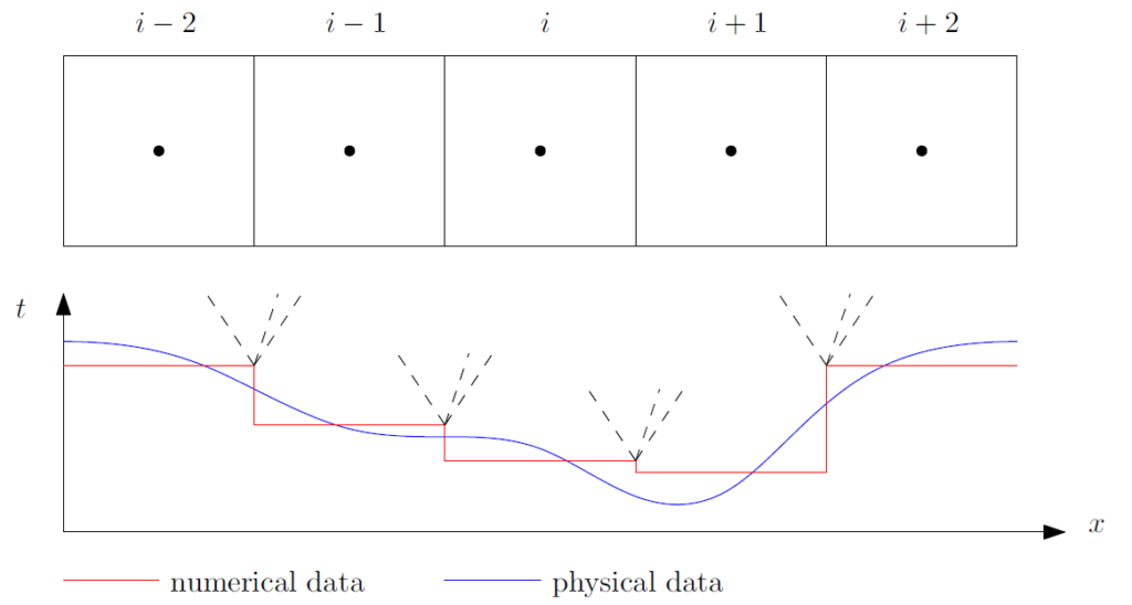 Here, I show five cells that store some physical properties (velocity, pressure, temperature, etc.) at their centroid values. If we are using a finite volume discretisation, then we assume that the data within a cell is constant, and we take the centroid value everywhere in the cell. This also means that when we approach a face that is shared between two cells, we naturally create a discontinuity. This is shown by the graph below the cells, where the real, physical solution is smooth (shown in blue), but the approximated solution (red) contains discontinuities.