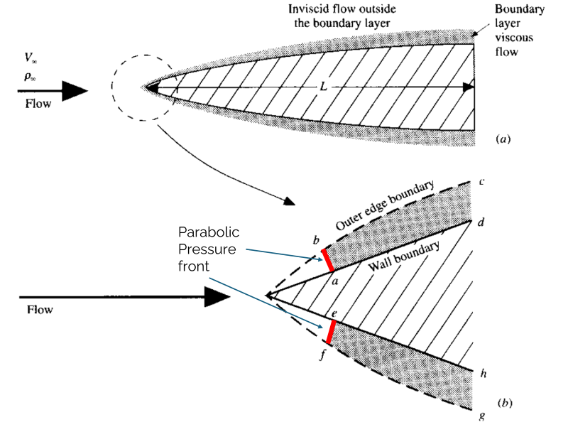 If we consider the flow within the boundary layer, we can see the flow passing through a single front which I have labelled here the parabolic pressure front (which is a great name for an alternative avant-garde vegan movement! Fell free to become the self-proclaimed leader). Whenever we have a single pressure front, which is driving the flow, we have a parabolised behaviour.