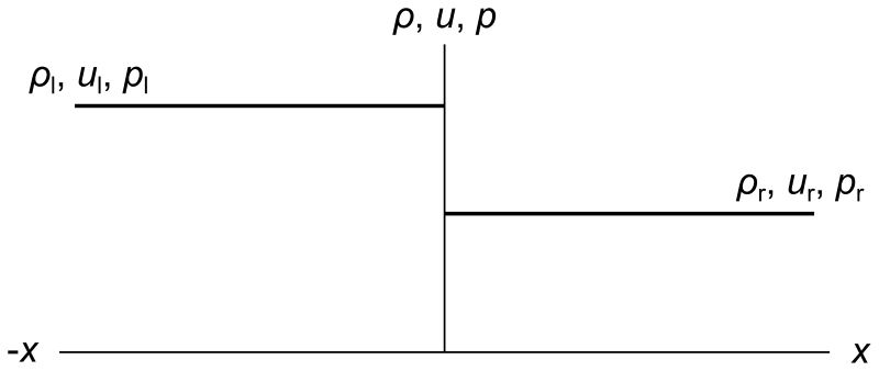 To understand these characteristics, let's look at a classic example: the (Sod) shock tube problem. If you start out writing your own compressible Euler solver, then you'll likely start implementing the shock tube problem first. It is a great example as you have to deal with discontinuities (which are a pain to capture using numerical schemes) while you can keep the complexity low, as it works just as well in 1D, as it does in 2D and 3D.