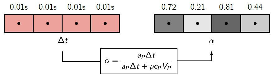 Here, [katex]\alpha[/katex] is the under-relaxation factor, and [katex]a_P[/katex], as well as [katex]c_P[/katex] are coefficients that come out from the discretisation. We see that if we have a constant time-step for each cell (shown on the left), we get different under-relaxation factors for each cell (on the right).