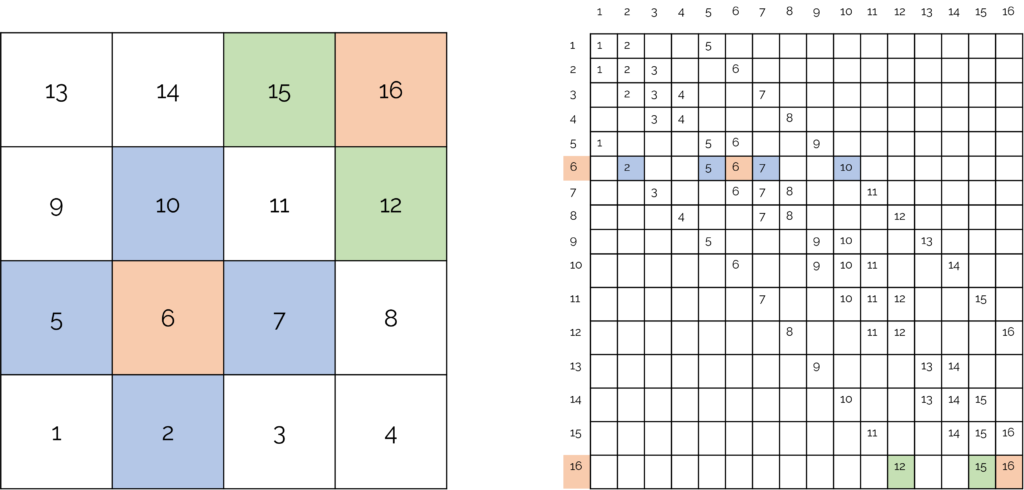 Let's look at a structured, 2D grid, and how the matrix would look in this case. Below is an example of a 4 by 4 2D mesh, and we are focusing on cells 6 and 16 here. We show its direct neighbours, and then how the matrix structure would look like. We use colours to highlight where in the matrix each element is stored.