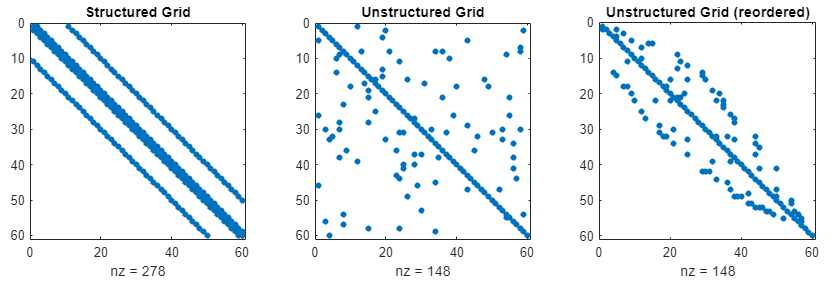Unstructured grids, on the other hand, have no clear ordering of neighbours so their sparse matrices look somewhat random. Below is an image that shows typical matrix structures for structured and unstructured matrices, to compare their form. Here, we simply visualise all elements that have a non-zero value with a blue dot and zero values are not shown. This allows us to see the sparse matrix structure.
