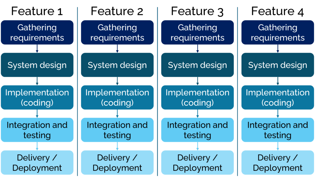 This approach essentially follows the waterfall approach but it breaks tasks down to small units that can be worked on and implemented in a much smaller timeframe. Crucial to agile software development is the requirement that once a feature is completed and tested, however small it may be, it gets integrated into the main codebase.